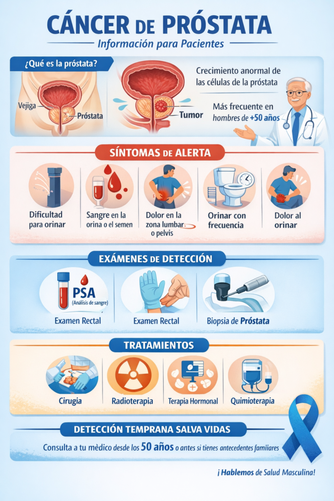 En muchos casos el cáncer de próstata crece lentamente y puede no causar síntomas en etapas iniciales. Por esta razón, la detección temprana mediante controles preventivos es fundamental.